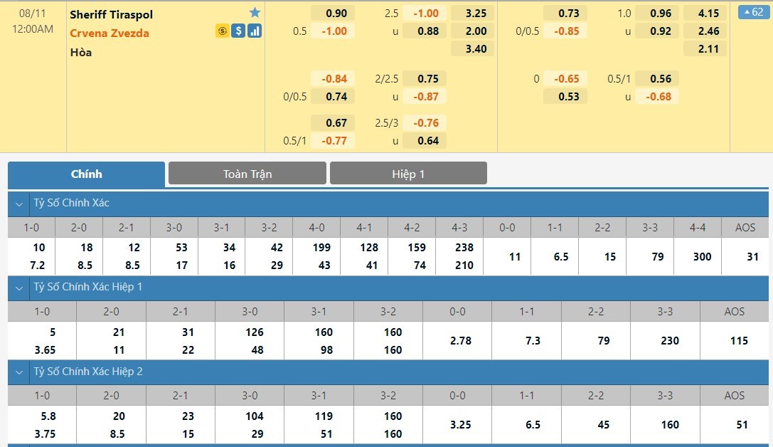 Tỷ lệ kèo cá cược bóng đá trận FC Sheriff vs Crvena Zvezda