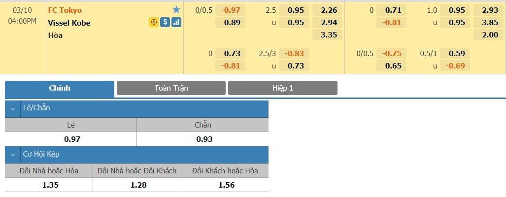 Tỷ lệ kèo cá cược bóng đá trận FC Tokyo vs Vissel Kobe