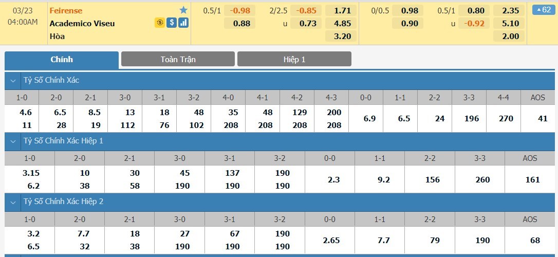 Tỷ lệ kèo cá cược bóng đá trận Feirense vs Academico Viseu