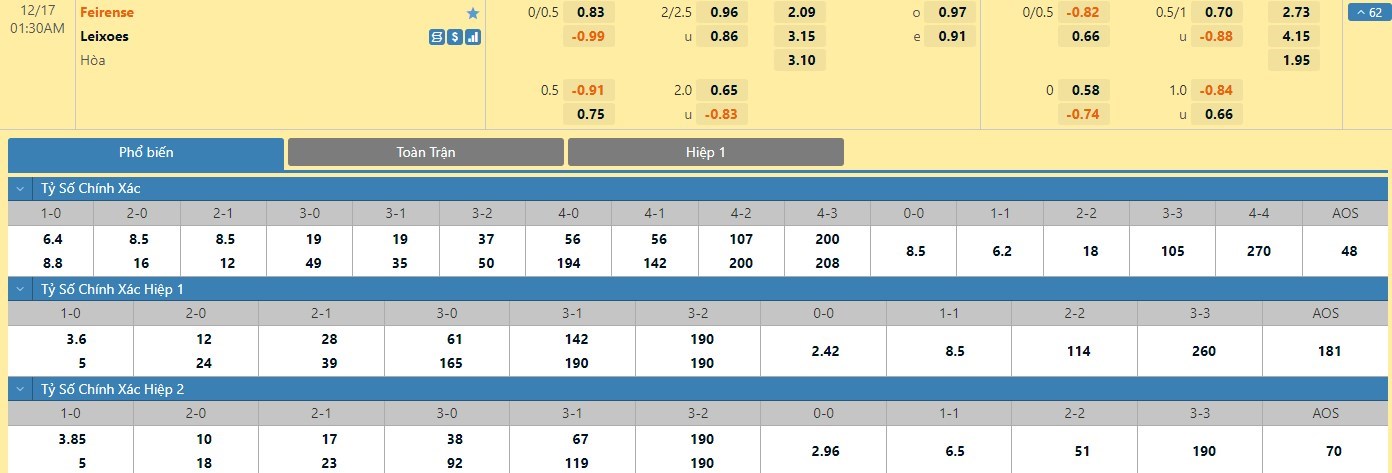 Tỷ lệ kèo cá cược bóng đá trận Feirense vs Leixoes