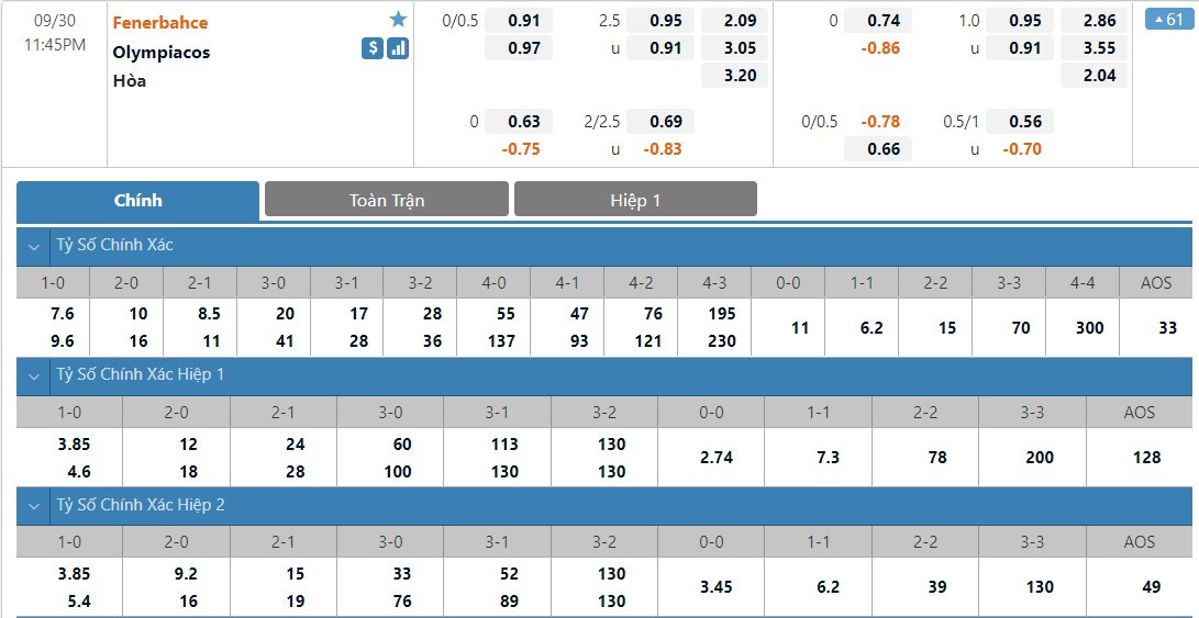 Tỷ lệ kèo cá cược bóng đá trận Fenerbahce vs Olympiacos
