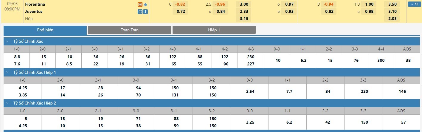Tỷ lệ kèo cá cược bóng đá trận Fiorentina vs Juventus