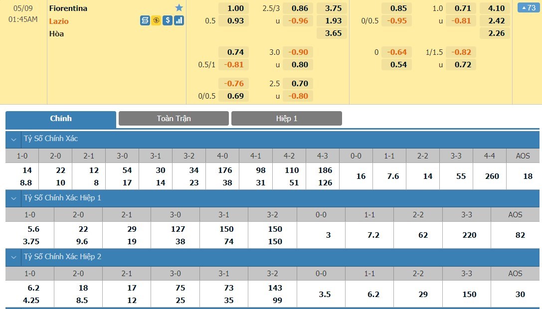 Tỷ lệ kèo cá cược bóng đá trực tuyến trận Fiorentina vs Lazio