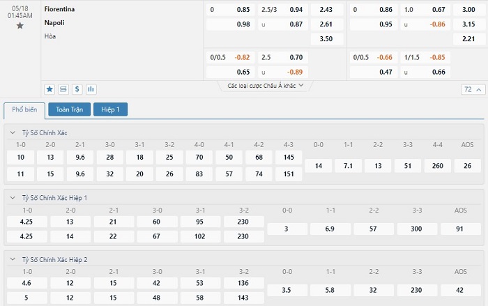 Tỷ lệ kèo cá cược bóng đá trực tuyến trận Fiorentina vs Napoli