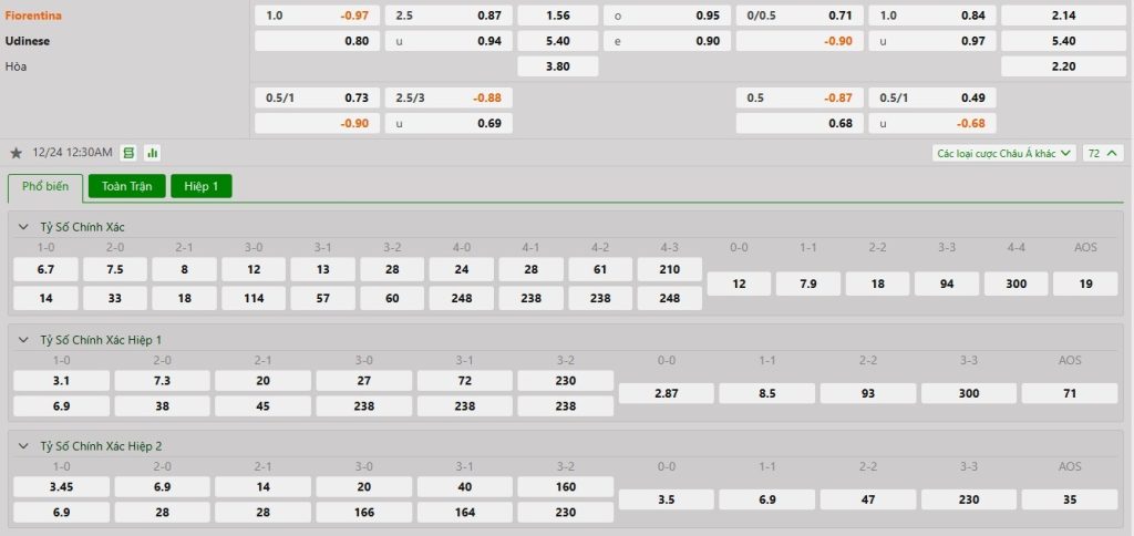 Tỷ lệ kèo cá cược bóng đá trực tuyến trận Fiorentina vs Udinese