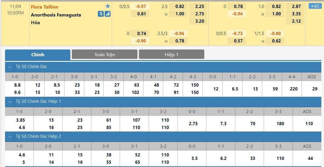 Tỷ lệ kèo cá cược bóng đá trận Flora Tallinn vs Anorthosis Famagusta