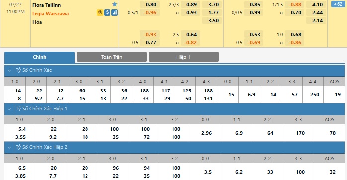 Xem tỉ lệ kèo cá cược bóng đá trực tuyến Flora Tallinn vs Legia Warszawa