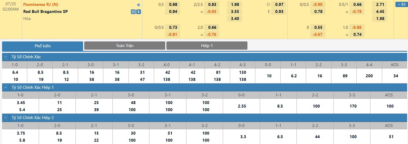 Tỷ lệ kèo cá cược bóng đá trận Fluminense vs Red Bull Bragantino