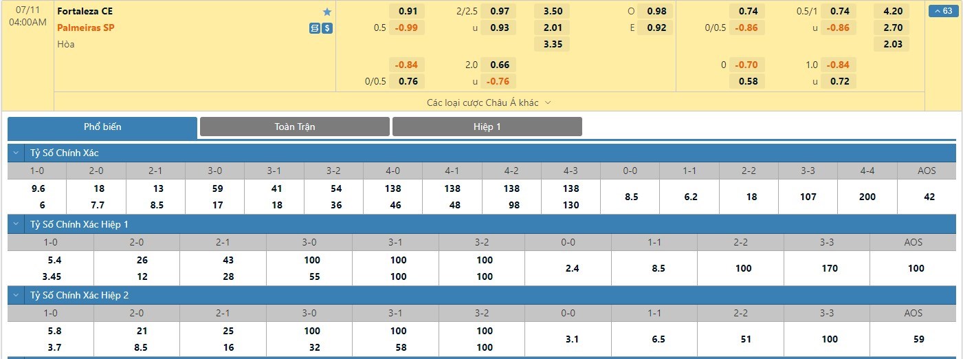 Tỷ lệ kèo cá cược bóng đá trận Fortaleza vs Palmeiras