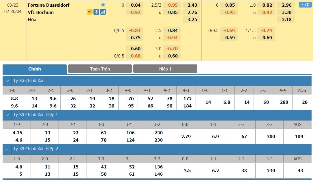 Xem tỷ lệ kèo cá cược bóng đá trực tuyến Fortuna Duesseldorf vs Bochum