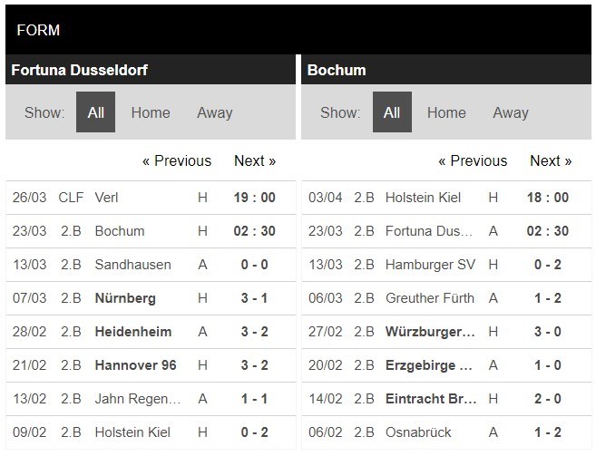 VfL Bochum vừa nhận thất bại 2 bàn không gỡ trên sân nhà trước đối thủ cạnh tranh trực tiếp là Hamburger SV. Đội bóng này cũng vừa chấm dứt chuỗi 2 trận toàn thắng trước đó của mình. Khép lại 25 vòng đấu đầu tiên, với 48 điểm, họ vẫn đang đứng đầu BXH nhưng chỉ còn hơn vị trí thứ 2 có 2 điểm nữa mà thôi. Sau khi Hamburger có thắng lợi 2-0 trước Heidenheim ở loạt trận sớm vòng 26 thì tạm thời Bochum đã bị đẩy xuống vị trí thứ 2. Họ cần phải giành trọn 3 điểm trước Fortuna Duesseldorf nếu như muốn lấy lại vị trí dẫn đầu. Ra sân với áp lực phải thắng, chắc chắn Bochum đặt quyết tâm cao độ nhưng chủ nhà Fortuna Duesseldorf không phải cái tên dễ bắt nạt.