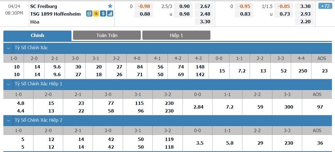 Tỷ lệ kèo cá cược bóng đá trận Freiburg vs Hoffenheim
