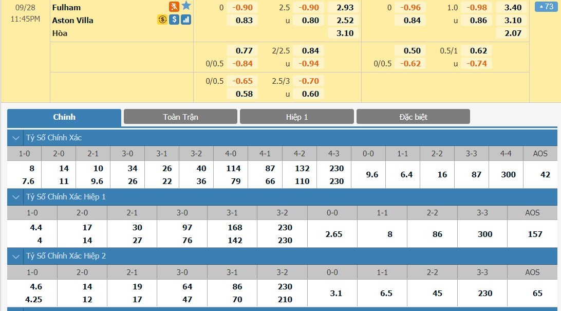 Xem tỷ lệ kèo cá cược bóng đá trực tuyến Fulham vs Aston Villa