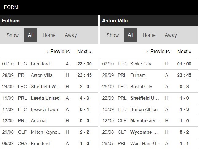 Xét 5 lần chạm trán gần đây nhất giữa 2 đội, Fulham lại là đội có thành tích đối đầu tốt hơn với 4 thắng và chỉ 1 thất bại trước Aston Villa. Tuy nhiên, thành tích của đôi bên ở mùa giải năm nay cho đến hiện tại là hoàn toàn khác nhau. Nếu như Fulham toàn thua 2 trận đầu tiên thì Aston Villa có 3 thắng lợi trên mọi đấu trường. Tuy nhiên, lịch thi đấu của 2 đội là hoàn toàn khác nhau. Chạm trán nhau với sự cân bằng, 90 phút tới khó lòng xuất hiện nhiều pha lập công.