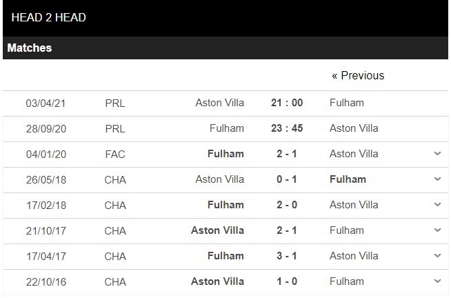 Thống kê đối đầu Fulham vs Aston Villa