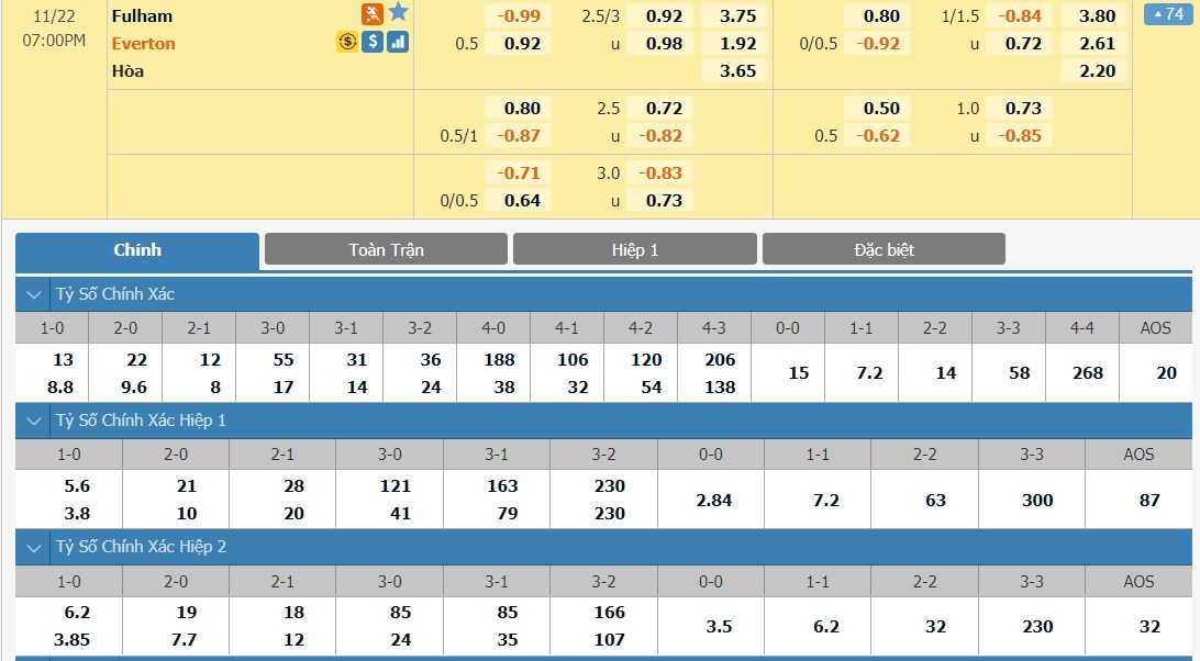 Tỷ lệ kèo cá cược bóng đá trực tuyến trận Fulham vs Everton