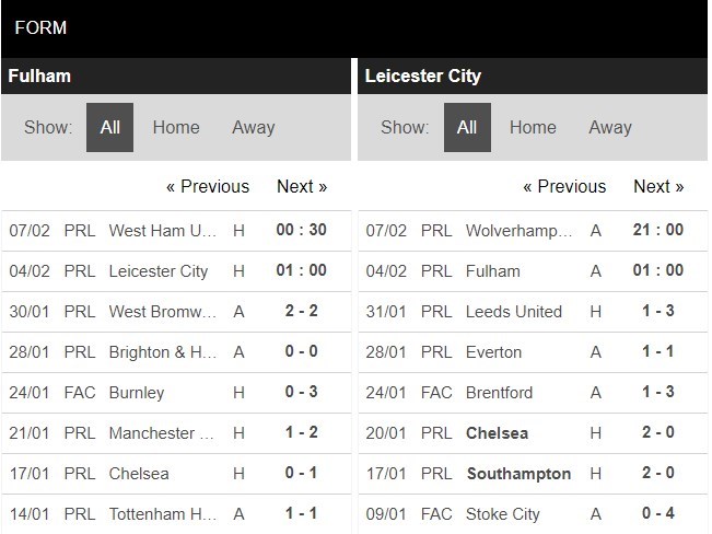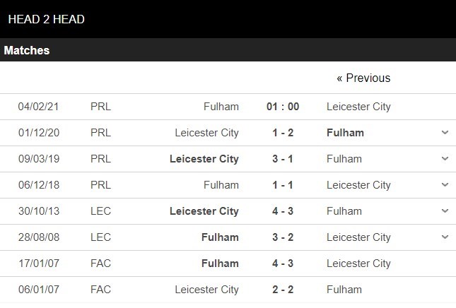 Thống kê trong 5 lần chạm trán gần đây nhất giữa Fulham và Leicester, mỗi bên có 2 thắng, 2 thua và 1 kết quả hoà. Sân nhà Craven Cottage chưa thể mang lại những kết quả tốt đối với Fulham. Đội bóng thủ đô này đã thua 2 và hoà 3 trong 5 trận gần đây nhất tại đây. Phía bên kia, Leicester bất bại 5 trận sân khách gần nhất khi thắng 3 hoà 2. Theo chuyên gia phân tích thị trường cá cược Lucky88, trận đấu này khả năng giành 3 điểm đang mở ra cho đội khách.
