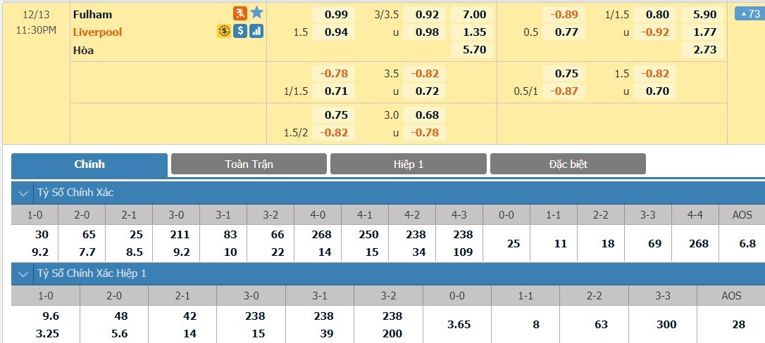 Tỷ lệ kèo cá cược bóng đá trực tuyến trận Fulham vs Liverpool