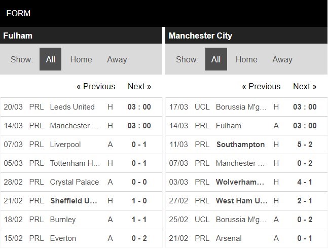 Thống kê phong độ Fulham vs Manchester City