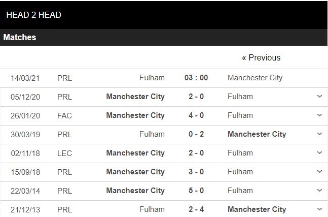 Thống kê đối đầu Fulham vs Manchester City