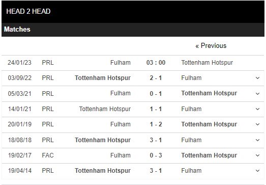 Thống kê đối đầu Fulham vs Tottenham