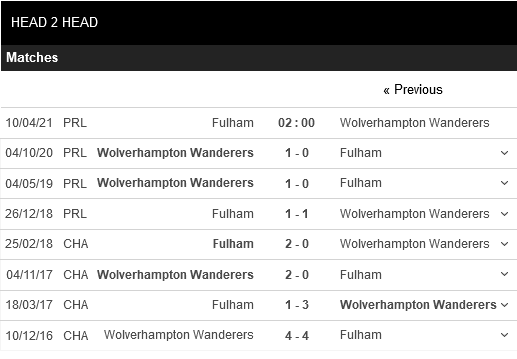 Thống kê đối đầu Fulham vs Wolverhampton