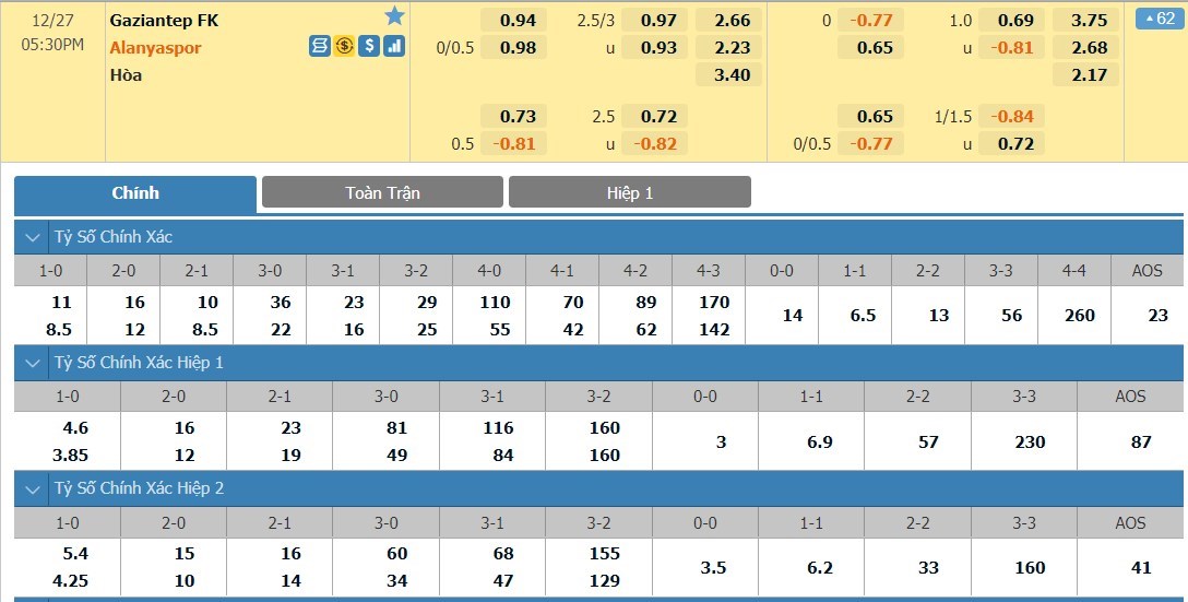 Tỷ lệ kèo cá cược bóng đá trận Gaziantep FK vs Alanyaspor