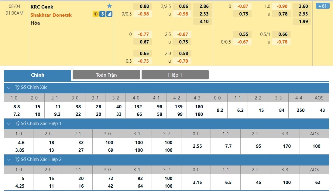 Tỷ lệ kèo cá cược bóng đá trực tuyến trận Genk vs Shakhtar Donetsk