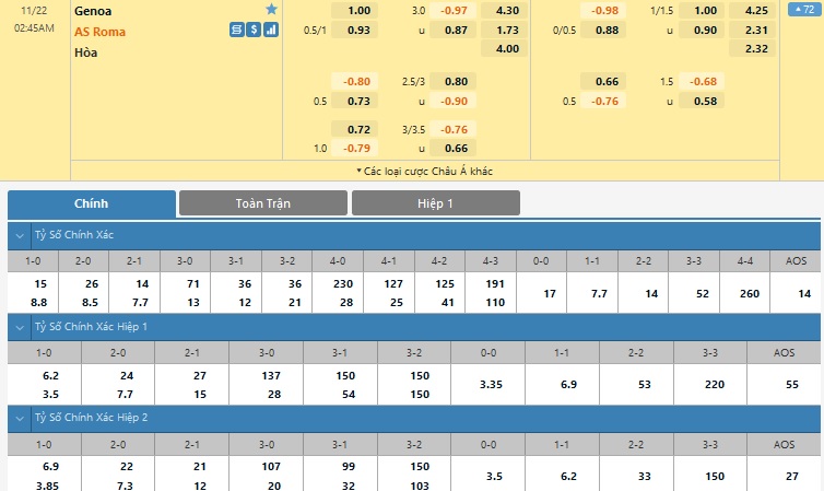 Chu kỳ lên xuống tỷ lệ kèo Genoa vs AS Roma