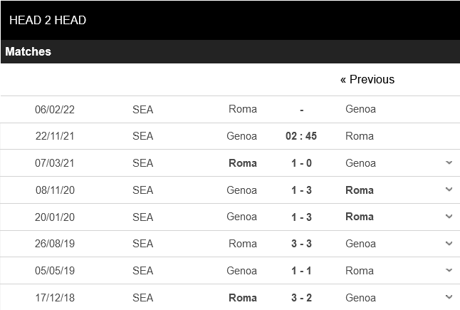 Thống kê đối đầu Genoa vs AS Roma