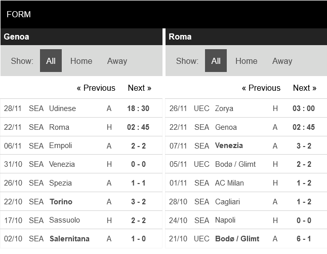 Roma bước vào trận gặp Genoa với 3 trận không thắng liên tiếp, trong đó có 2 trận thua liền ở Serie A trước Milan và Venezia. Trên thực tế, đà đi xuống của Roma đã kéo dài từ trận thua Lazio hồi cuối tháng 9. Kể từ đó, họ chỉ thắng 3/9 trận đã đấu, thua tới 4.