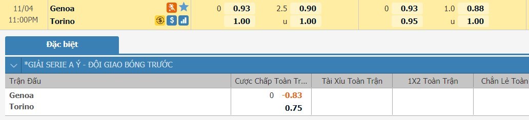 Tỷ lệ kèo cá cược bóng đá trận Genoa vs Torino