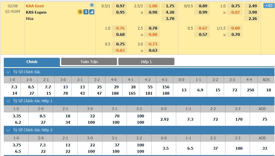 Tỷ lệ kèo cá cược bóng đá trận Gent vs Eupen