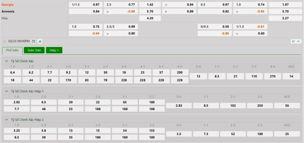Xem tỷ lệ kèo cá cược bóng đá trực tuyến Georgia vs Armenia