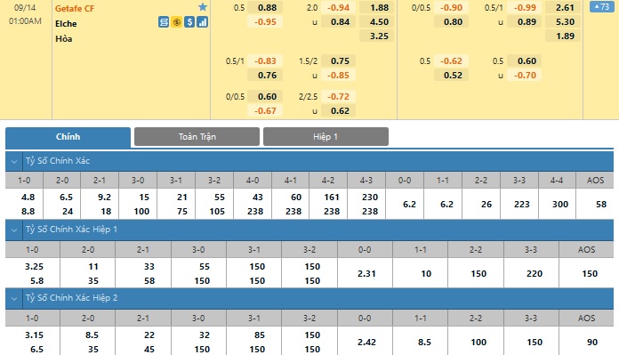 Xem tỉ lệ kèo cá cược bóng đá trực tuyến Getafe vs Elche
