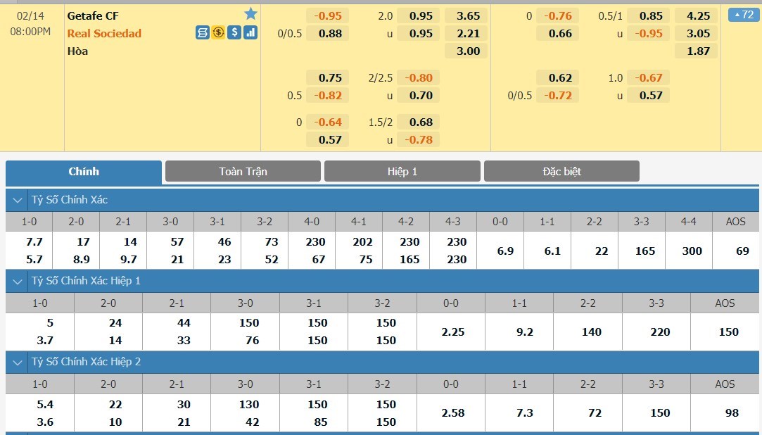 Tỷ lệ kèo cá cược bóng đá trận Getafe vs Real Sociedad