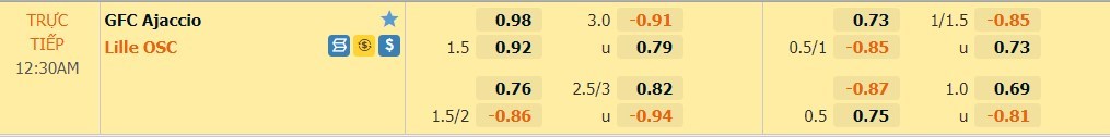 Tỷ lệ kèo cá cược bóng đá trận GFC Ajaccio vs Lille