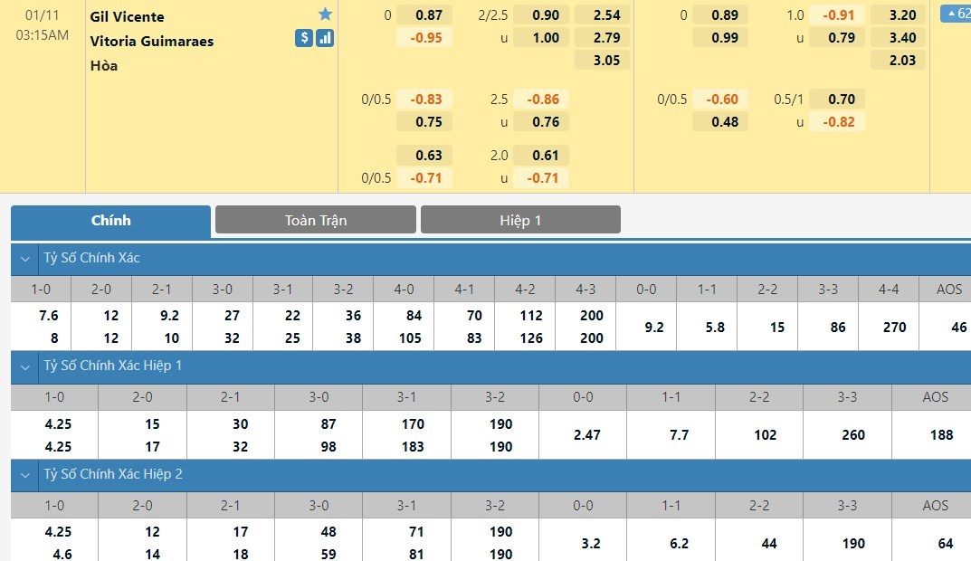 Tỷ lệ kèo cá cược bóng đá trực tuyến trận Gil Vicente vs Vitoria de Guimaraes