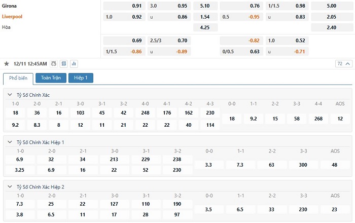 Tỷ lệ kèo cá cược bóng đá trực tuyến trận Girona vs Liverpool