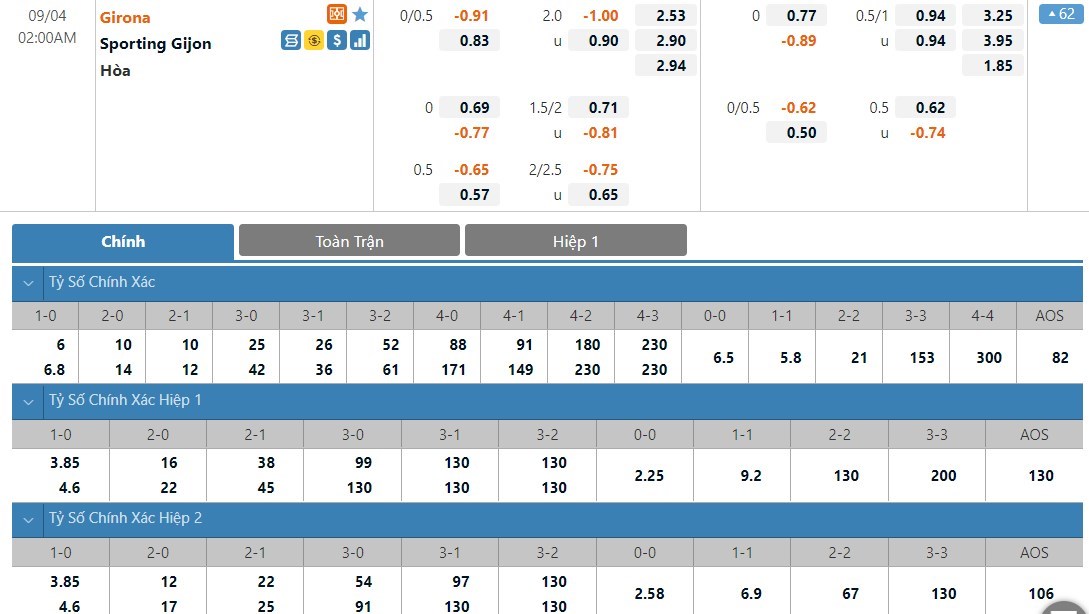 Tỷ lệ kèo cá cược bóng đá trận Girona vs Sporting Gijon