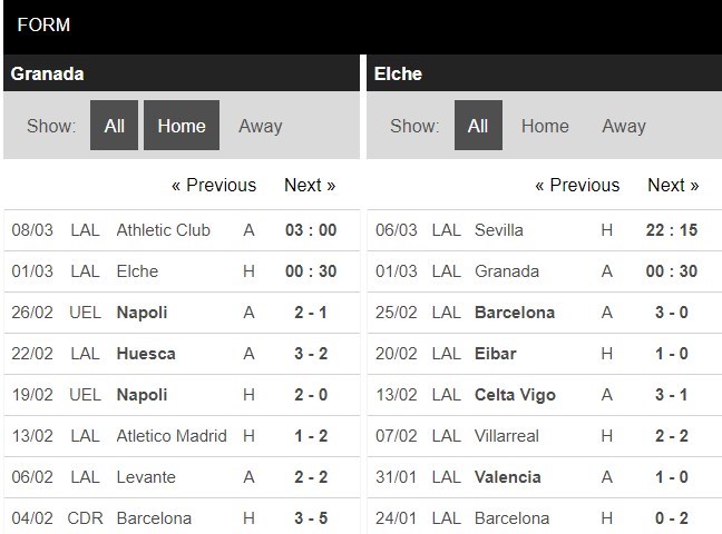Thống kê phong độ Granada vs Elche
