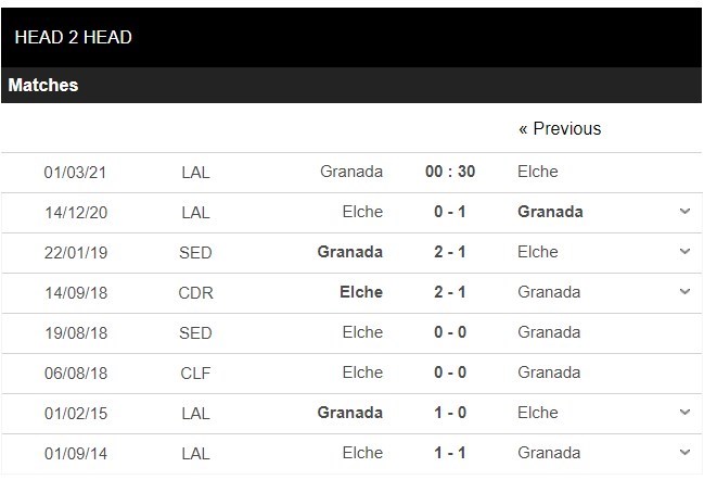 Thống kê đối đầu Granada vs Elche