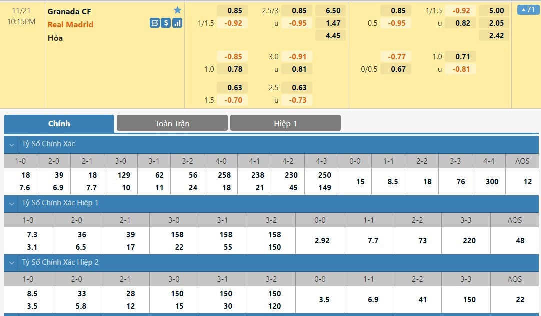 Tỷ lệ kèo cá cược bóng đá trận Granada vs Real Madrid