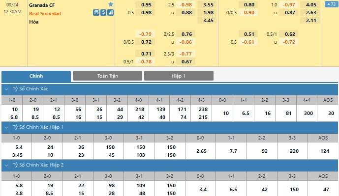 Xem tỉ lệ kèo cá cược bóng đá trực tuyến Granada vs Real Sociedad