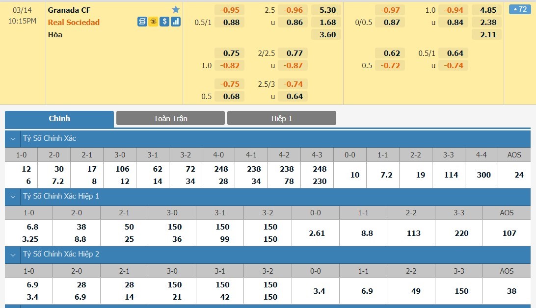 Hành quân tới làm khách trên sân của Granada nhưng Real Sociedad vẫn được nhà cái ưu ái cho vị thế đội bóng cửa trên chấp tỷ lệ -3/4 bàn. Mốc chấp cho thấy giới chuyên môn đang đặt niềm tin lớn lao vào khả năng chiến thắng của Real Sociedad. Lịch sử đối đầu cũng ủng hộ cho Real Sociedad khi ở 10 lần chạm trán gần nhất giữa hai đội, Real Sociedad giành được 6 chiến thắng, 2 trận hòa và chỉ thua 2 trận.