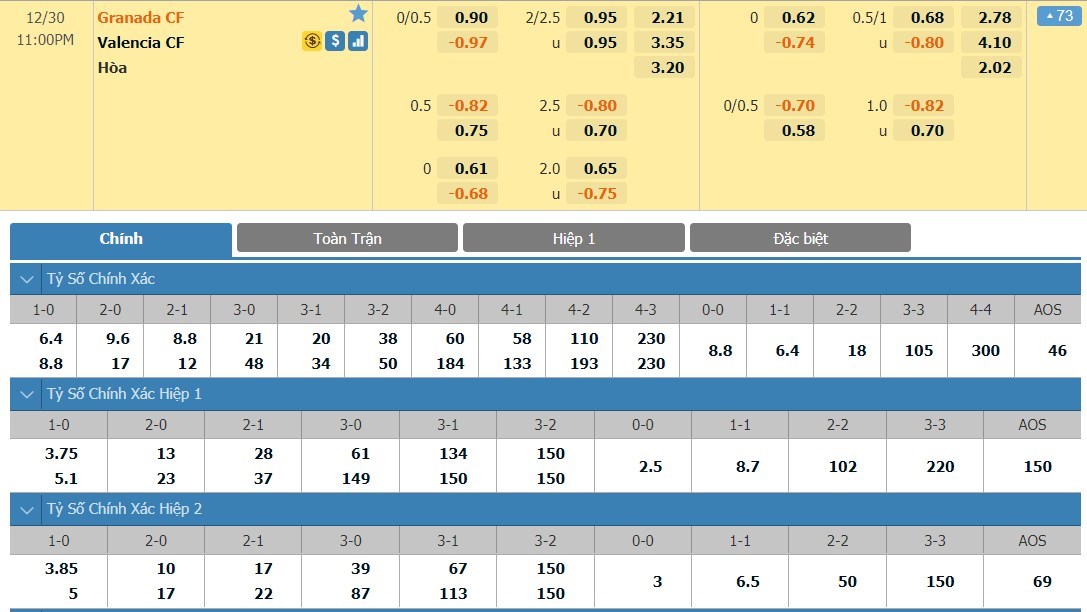 Tỷ lệ kèo cá cược bóng đá trực tuyến trận Granada vs Valencia