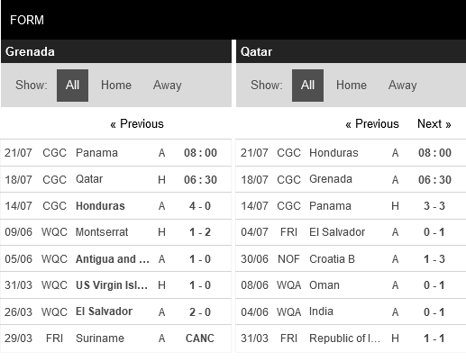 Qatar đã bất bại trong 9 trận gần nhất với 7 trận thắng và 2 trận hòa. Họ cũng ghi được 3 bàn ở 2/3 trận gần đây. Trái lại, Grenada thua 4/5 trận gần nhất và không có sự chuẩn bị tốt cho Gold Cup. Mà quả thực thì dù có chuẩn bị tốt đến đâu cũng khó làm nên chuyện với lứa cầu thủ hiện tại.