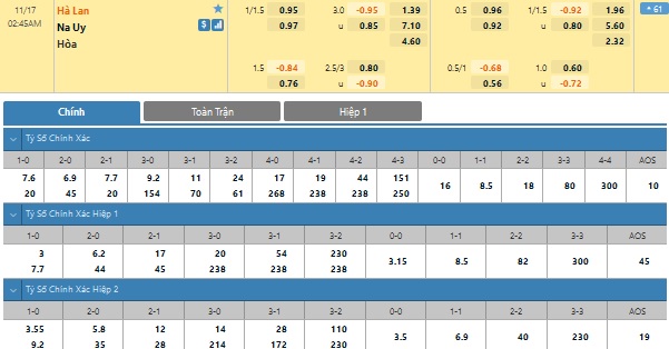 Xem tỉ lệ kèo cá cược bóng đá trực tuyến Hà Lan vs Na Uy