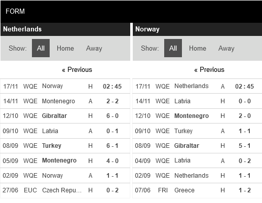 Hà Lan đạt thành tích thắng hiệp 1 rất tốt ở vòng loại World Cup lần này. Họ thắng tới 7/9 trận trong hiệp 1, kể cả trận hòa Montenegro gần đây. Trong khi đó, Na Uy thắng 5/9 trận trong hiệp 1, đạt tỉ lệ thấp hơn.