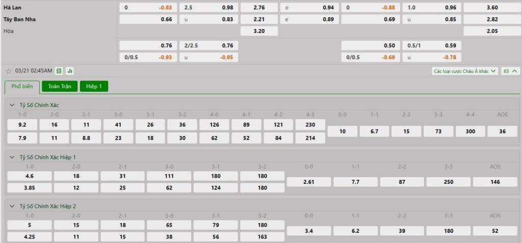 Xem tỷ lệ kèo cá cược bóng đá trực tuyến Hà Lan vs Tây Ban Nha